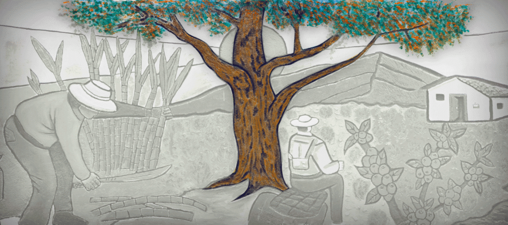 En este mismo sector se desarrolla un paisaje cafetero, donde se ubican un recolector de café descansando bajo un árbol y dos jóvenes que transitan por un camino rural que atraviesa los cultivos, llevan los implementos propios de la cosecha y el radio, como elemento recurrente que evoca la música, la información y la compañía en medio de las jornadas, sin embargo, los radios están rotos, en representación de lo que se rompió en las familias que perdieron a sus seres queridos, de las vidas arrebatadas y los sueños destrozados. En el fondo, una casa campesina refuerza el sentido de arraigo, pertenencia y resiliencia familiar.