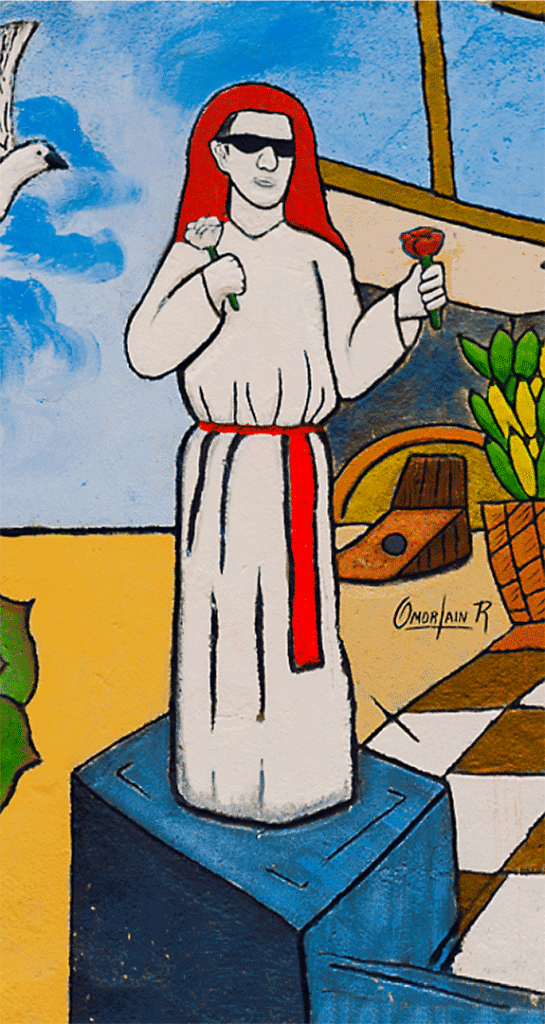 Muy cerca de esta imagen, se incorpora de manera destacada la figura de la “estatua humana”, caracterizada por su postura firme y por sostener rosas en sus manos. Aunque la imagen remite a prácticas artísticas urbanas, en el mural adquiere un significado profundo: simboliza a uno de los jóvenes víctimas que fue atraído mediante promesas de trabajo en un contexto de vulnerabilidad. Su presencia introduce una ruptura simbólica en el paisaje rural, conectando lo urbano con el territorio y evidenciando las dinámicas de engaño que dieron lugar a las ejecuciones extrajudiciales.