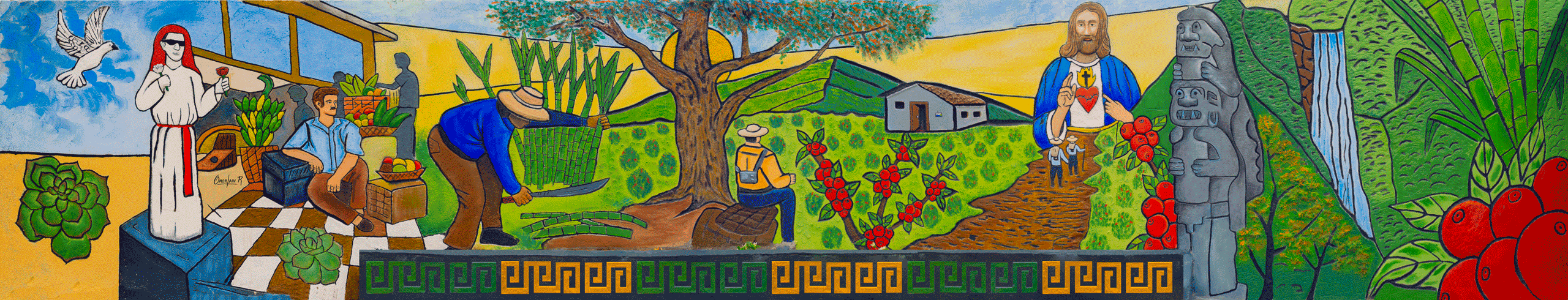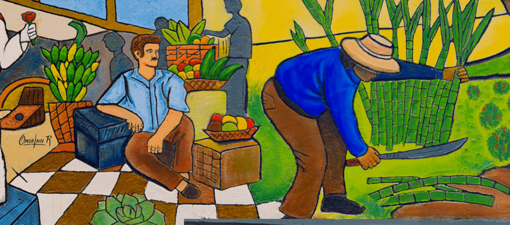 Hacia la zona central del mural se configura una escena representativa del municipio: un trabajador agrícola realiza el corte de caña de azúcar utilizando herramientas tradicionales. Su postura inclinada y el gesto corporal evidencian el esfuerzo físico propio de esta labor.